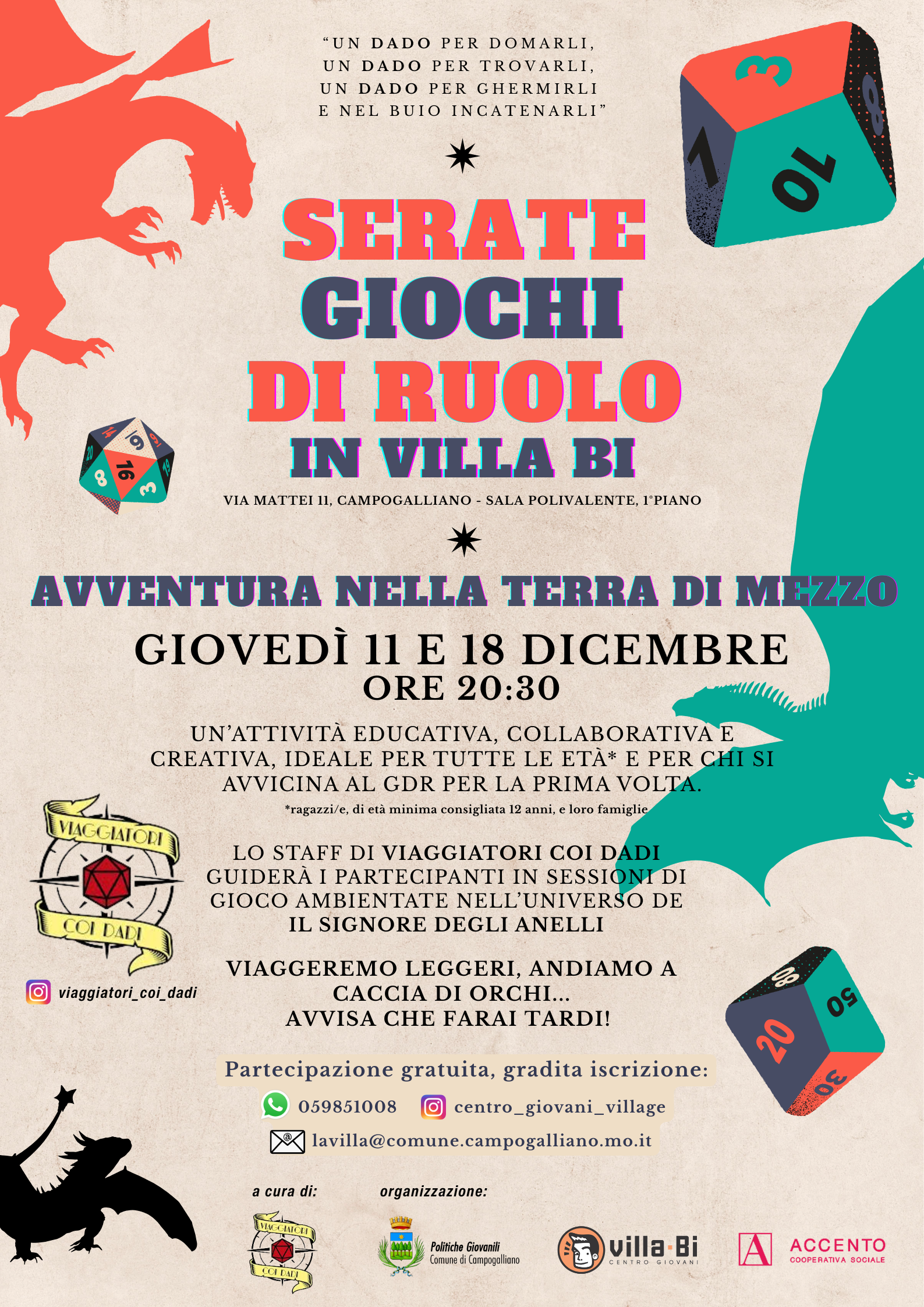 Giovedì 11 e 18 dicembre alle 20:30, nella Sala polivalente di Villa Bi, lo staff di Viaggiatori coi Dadi guiderà i partecipanti in sessioni di gioco di ruolo ambientate nell’universo del Signore degli Anelli.